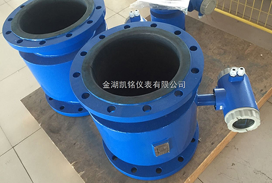 凱銘電磁流量計是以內襯絕緣材料做為非導磁合金短管;兩只電極沿管徑方向穿通壁固定在測量管上,其電極頭與襯里內表面基本齊平。勵磁線圈由雙向方波脈沖勱磁時,將在與測量管軸線垂直的方向上產生一磁通量密度為B的工作磁場;此時,如果具有一定電導率的液體流經測量管,將切割磁力線感應出電動勢E,電動勢E正比于磁通量密度B,測量管內徑d與平均流速V 的乘積。電動勢E(流量信號)由電極檢出并通過電纜送至轉換器。轉換器將流量信號放大處理后,可顯示流體流量,并能輸出脈沖,摸擬電流等信號,用于流量的控制和調節。