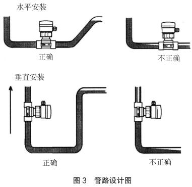 現場安裝時應注意遠離可能對其產生干擾的大型設備,防止長期的熱輻射和其他如磁場直射等環境影響。為確保高測量精度和較好的零點穩定性,進行校正前,航空煤油流量計應裝入工藝介質中至少 24 小時電極鈍化。安裝的管路設計應確保管道始終充滿流體,防止測量誤差,管路設計圖見圖 3。