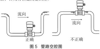 測量流向取決于航空煤油流量計的安裝方位,將航空煤油流量計在接頭上旋轉 180 度即可反向。正流向時,航空煤油流量計的突耳應在上游方向。流量顯示總是正的,而累加器可以根據流向增加或者減少。安裝中確認管路設計不允許在介質中產生氣泡或空腔,否則將引起測量誤差(見圖 5)。