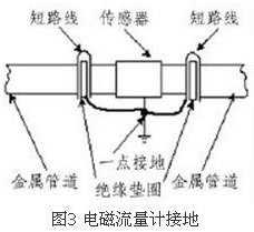 (4)盡量避開振動源、磁源(大功率電機、變壓器)由于水電磁流量計的測量感應電壓很小,電壓較低,易受外界電磁噪聲的影響,故在安裝時應進行可靠的接地連(跨)接。金屬管道水電磁流量計接地連(跨)接方法如圖3所示