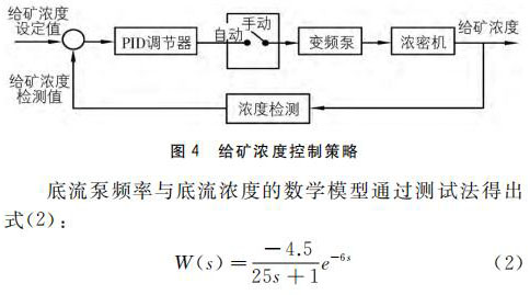 給礦濃度控制策略采用常規的PID調節器實現,如圖4所示。在該控制系統中,給礦濃度設定值以及反饋的給礦濃度檢測值為PID調節器的輸 入,PID 調節器的輸出為變頻泵的頻率。該頻率可進行自動與手動兩種控制模式。以變頻控制方式對濃密機的底流泵進行精密轉速控制,即可控制濃密機排出的底流礦漿的濃度。