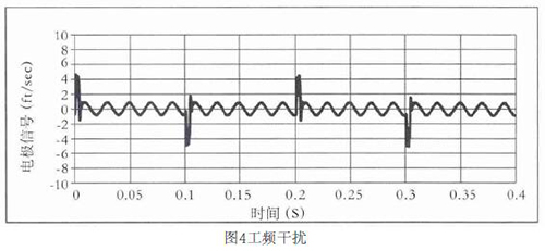 工頻干擾是硫酸管道流量計常見的干擾源。當流量計處于電源形成電磁場中時,由于分布電容的存在,以電磁波的輻射形式干擾電極信號,或者是由供電電源引入的工頻串擾,工作現場的工頻共模干擾,其產生的物理機理均是電磁感應原理。幅度與流量信號相比,往往要大幾個數量級,頻率與供電電源頻率相同。如圖4所示,線圈驅動頻率為5Hz的電極信號,被耦合了50Hz的工頻干擾,幅度大概相當于1feet/s。