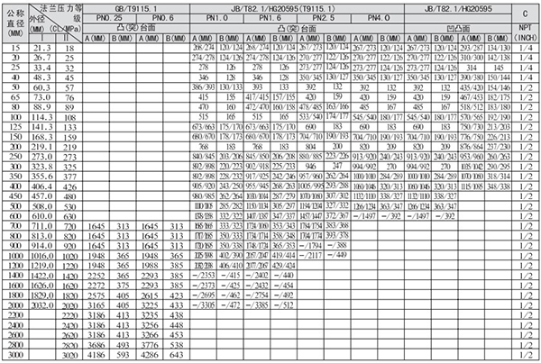 2.尺寸表中同一欄值有兩個并以/隔開,表示/下方的數值是以HG管法蘭尺寸計算所得。